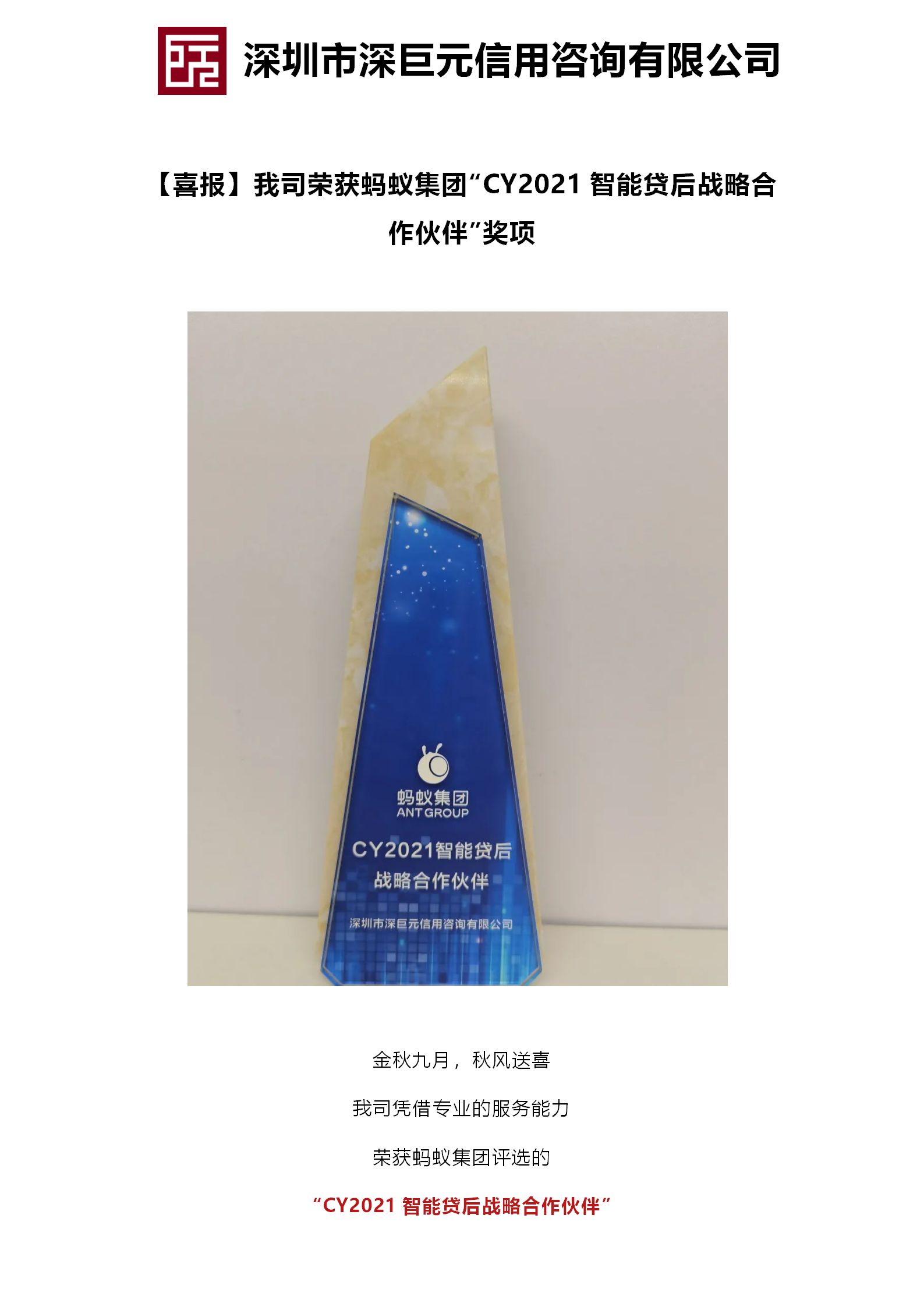 【喜報(bào)】我司榮獲螞蟻集團(tuán)“CY2021智能貸后戰(zhàn)略合作伙伴”獎(jiǎng)項(xiàng)